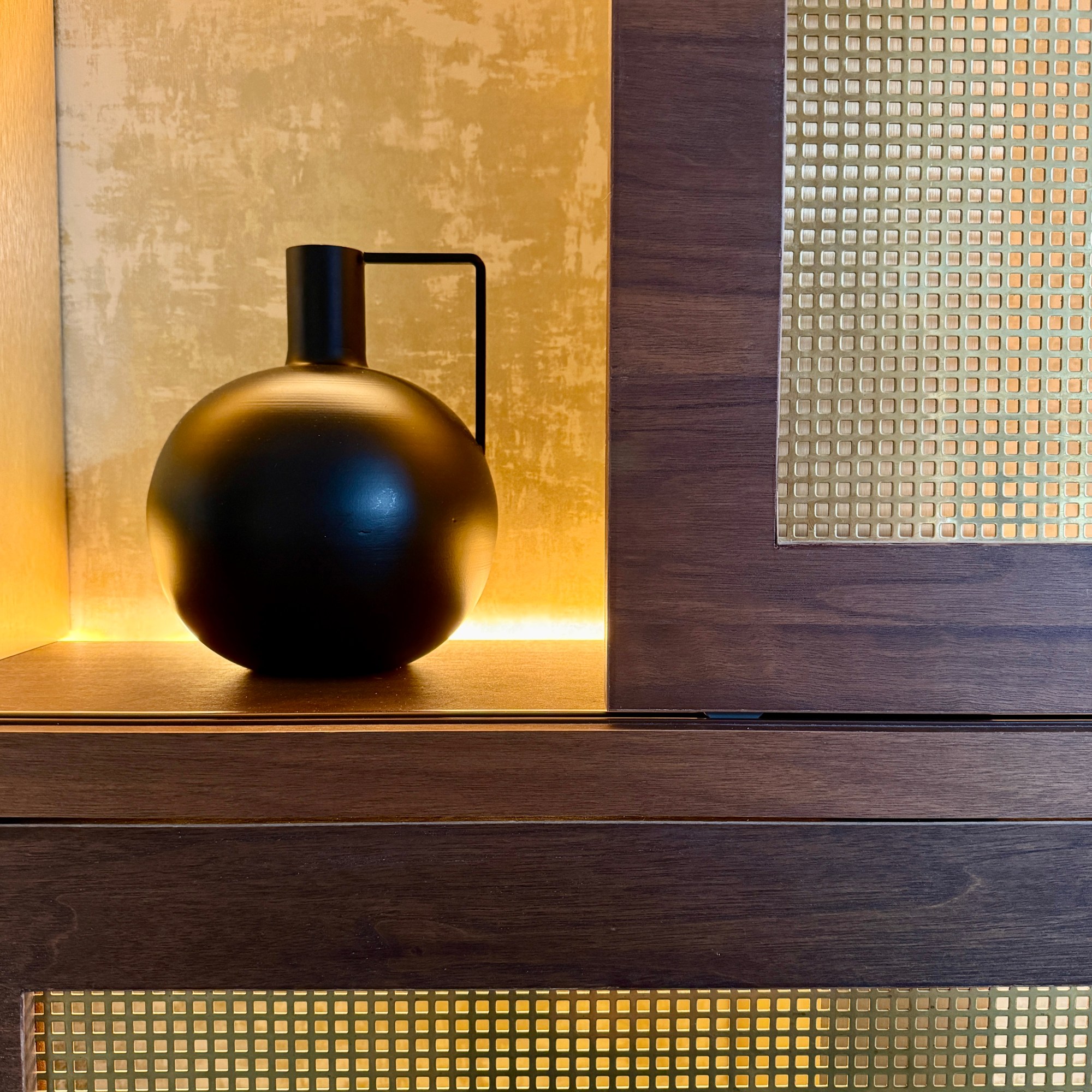 Les courbes organiques et épurées insufflent une fluidité naturelle aux espaces, rehaussées par des finitions en laiton et des touches délicates de porcelaine.