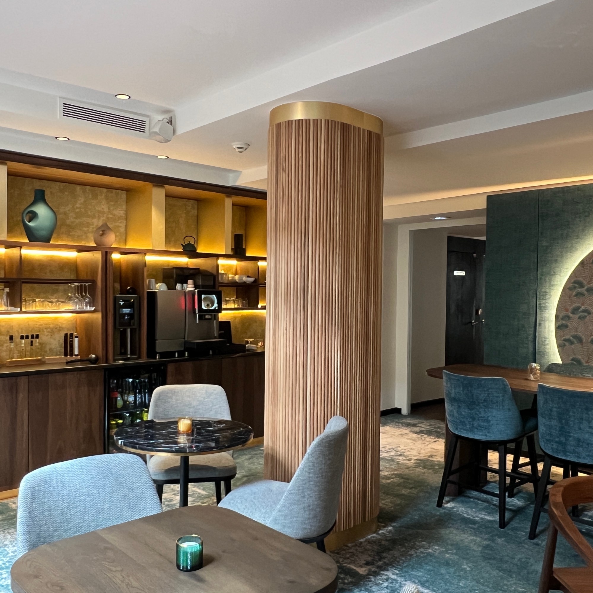 L’aménagement intérieur s’articule autour d’un concept chaleureux, pensé comme une maison parisienne où chaque détail sublime le confort et l’intimité. L’essence précieuse du noyer dialogue avec la douceur du velours, tandis que les teintes terreuses de terracotta et les camaïeux de bleu – du céladon à l’outremer profond – composent une palette subtile et enveloppante.